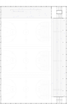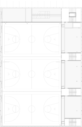 The building is organized on three levels with a clear separation of flows to ensure safety and efficiency. The ground floor hosts changing rooms, support spaces, storage, and technical rooms. On the first floor, the triple gym is designed with separate access for athletes and the public. The second floor includes the stands, a small café, and multifunctional rooms.